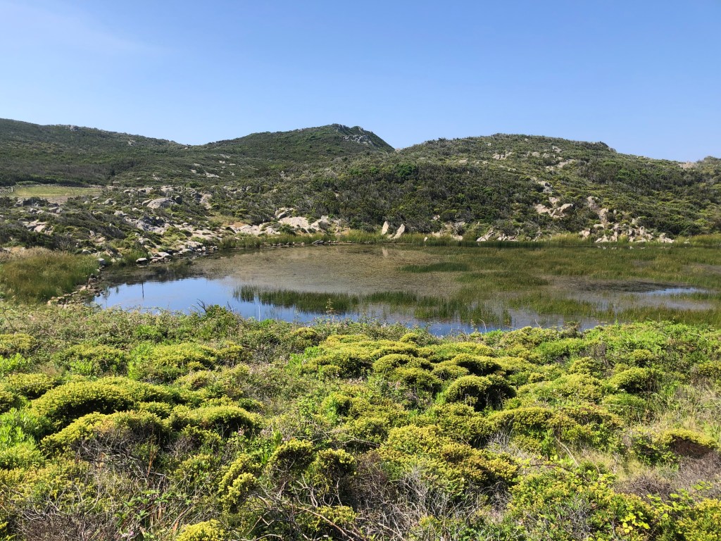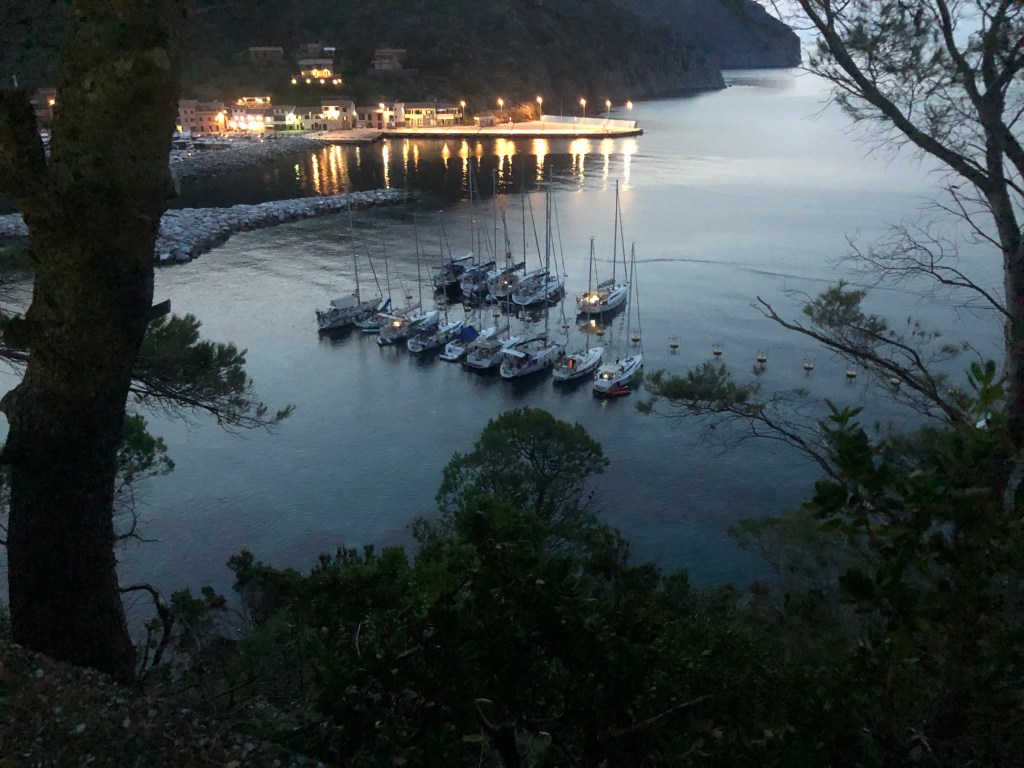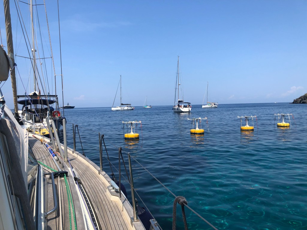 About 20 NM from Elba away but another world, Capraia is definitely worth visiting if you are sailing in this area. Forged from volcanic rock it is just over 7 sq. miles, 1800 hectares, with a highest peak of 466 meters. The harbour has very limited space and does not welcome large yachts. In the summer it’s a bit smelly, so you are much better securing to the unusual set of anchoring buoys just outside the harbour where someone will assist you to tie up. Go slowly as it is quite shallow in places. (Dragon II draws 1.8m.) Alternatively, you can anchor close by. I visited with accompanying hound, Grimmie, in June 2023 finding it quiet but very hot and we were foolish enough to tackle the highest peak. The views from the top took in the entirety of this petite island. Bizarely, close to the top there was small lake. Grimmie didn’t stop to question where the water came from and plunged in for a swim. His drenched coat kept him cool on the long walk down while I was left sweating buckets.