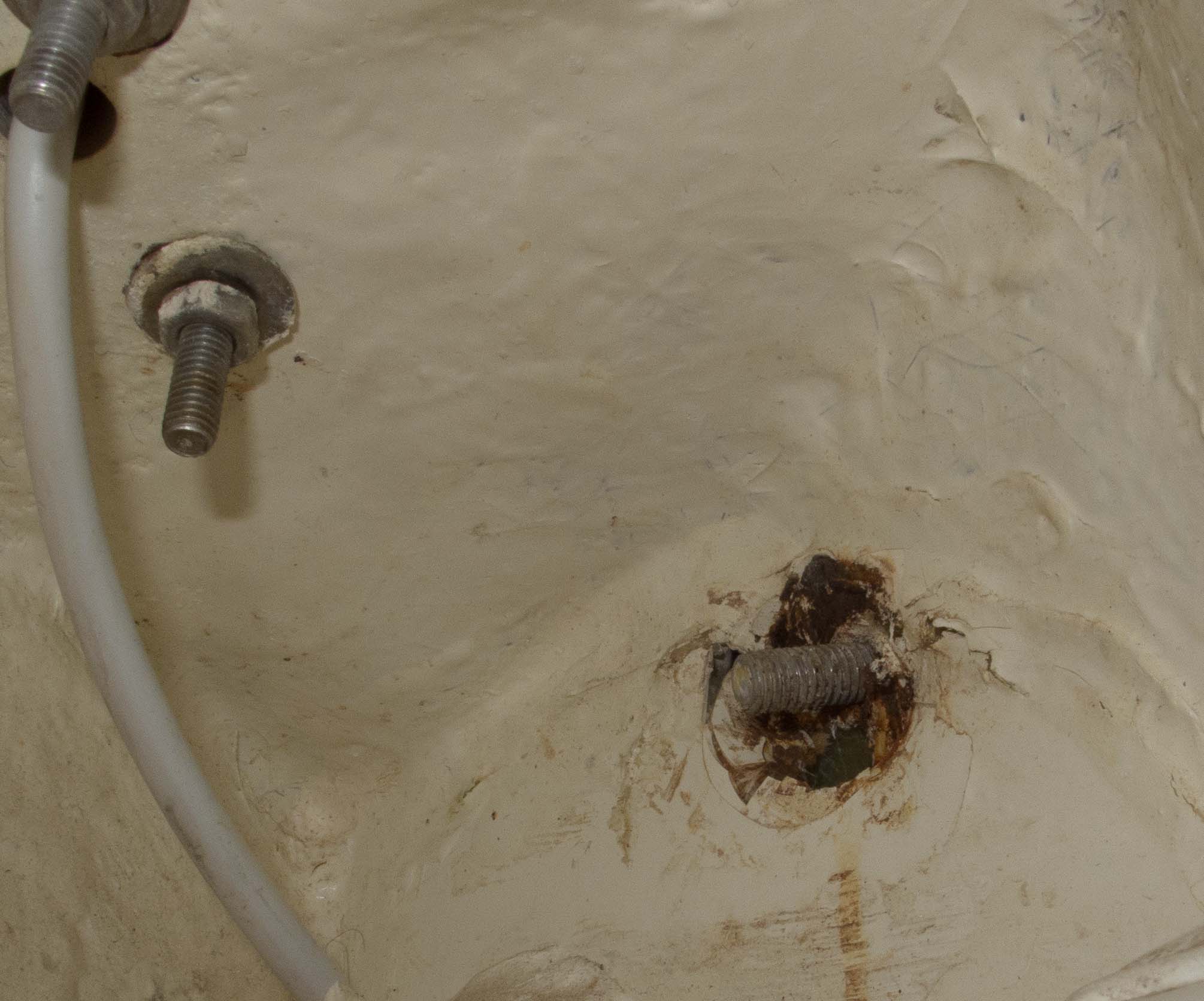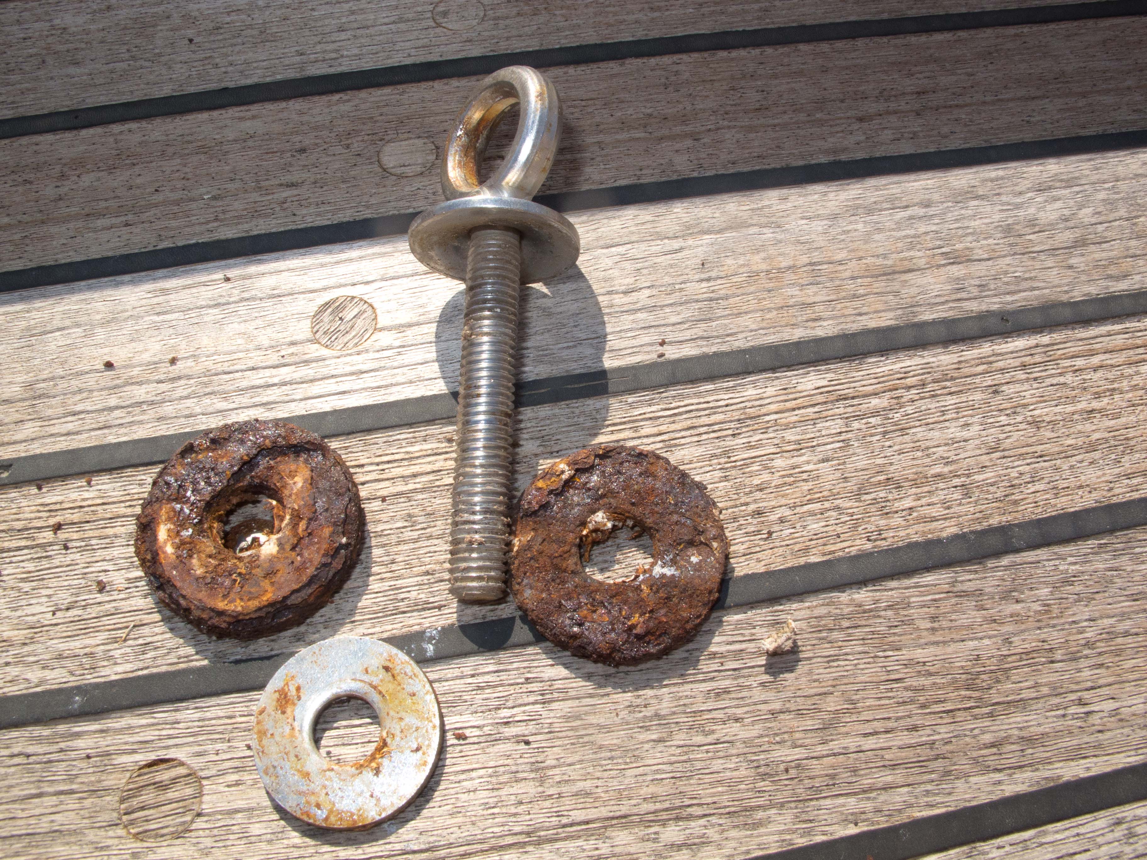 Not only were the original eyebolts rather small, the backing plates were badly corroded and there was no way they would have withstood any sort of force applied to them if someone went overboard for example.